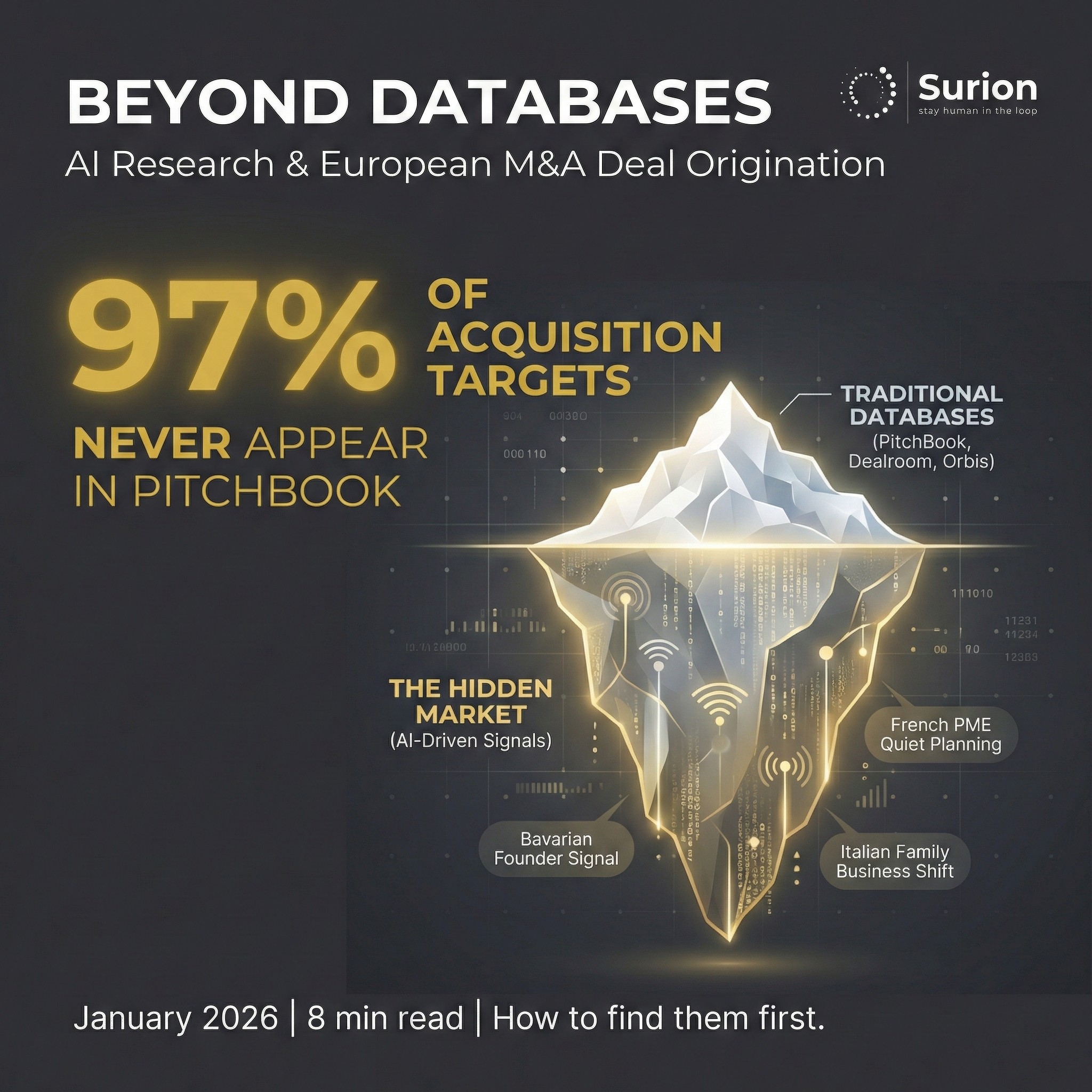 Traditional M&A databases cover about 3% of the global business population. PitchBook tracks 9.5 million companies. The German Mittelstand alone has 3.5 million. France has 4 million SMEs. Most of these businesses have never raised institutional funding, never announced a transaction, and exist outside the systems PE firms and strategic acquirers use.
